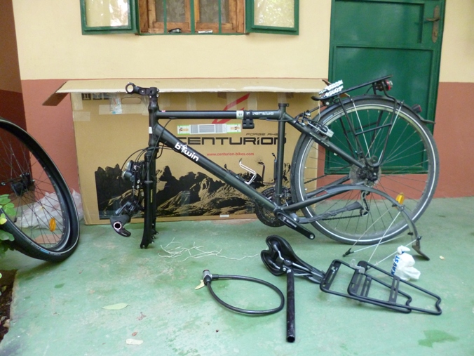auf mein Fahrrad dessen Verpackung am Vortag fast gescheitert waere. Von einem lokalen Fahrradhaendler